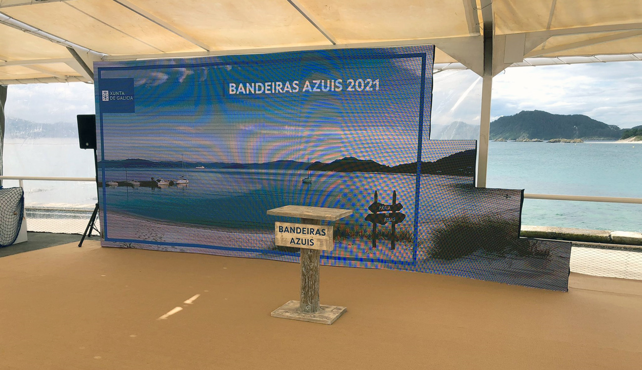 Para nosotros siempre es un privilegio y orgullo participar en la organización del acto de Entrega de Banderas Azules de Galicia, pero este ha sido un año muy especial. Por primera vez se ha realizado en un entorno único que proporcionan las Islas Cíes, y aunque ha sido todo un reto en cuestión de logística por el emplazamiento y que el tiempo no acompañó, la dedicación y esfuerzo dan sus frutos y el acto fue todo un éxito.